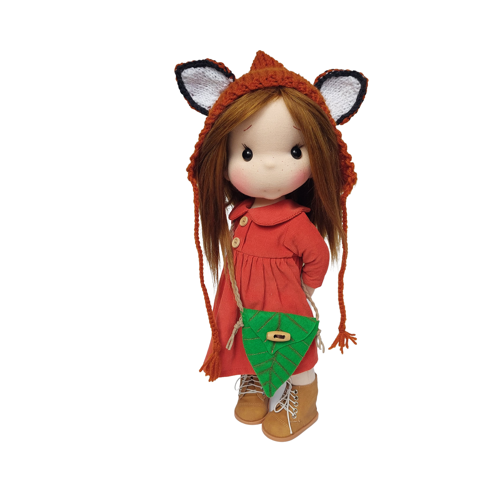 Puszysta i miękka czapka lisek wykonana z włóczki, doda twojej lalce niezwykłego uroku.