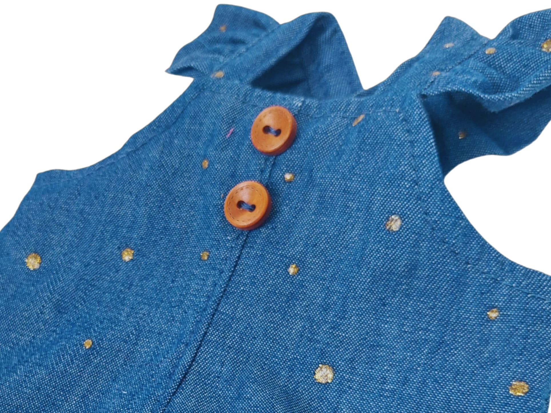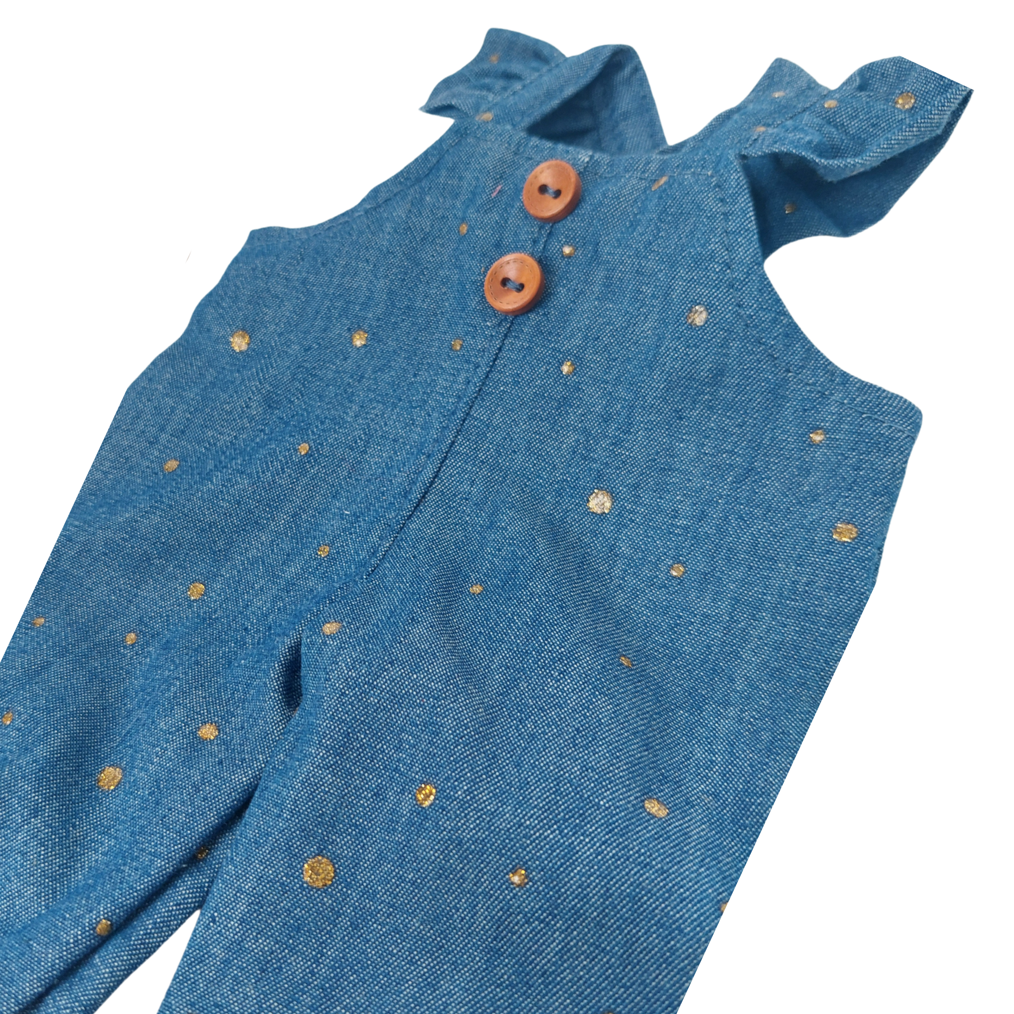 Urocze spodnie z falbanką i drewnianymi guziczkami. uszyte z miękkiego jeansu.