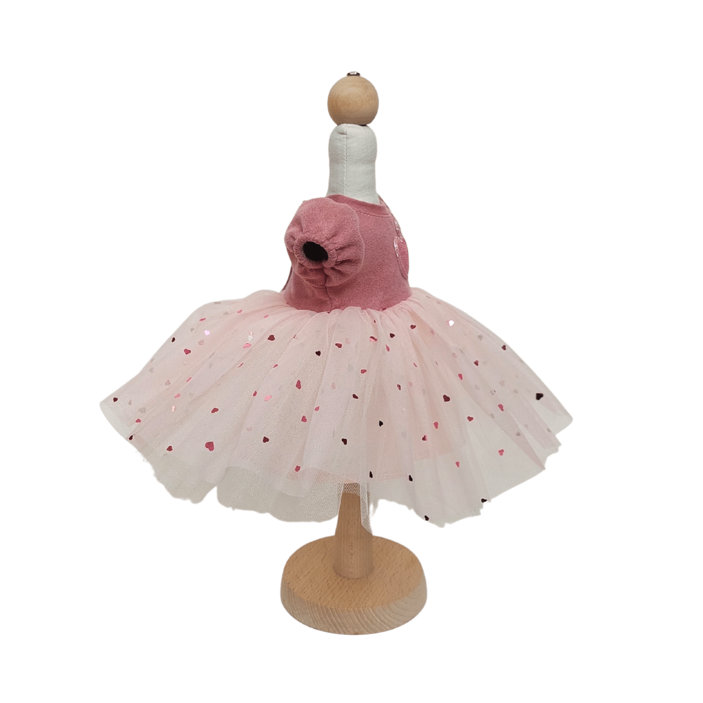 Sukienka Annabell uszyta z delikatnego tiulu w mieniące się serduszka i organicznego jerseyu w kolorze pudrowego różu. Cudowna i zwiewana kreacja, o której marzy nie jedna lalka.