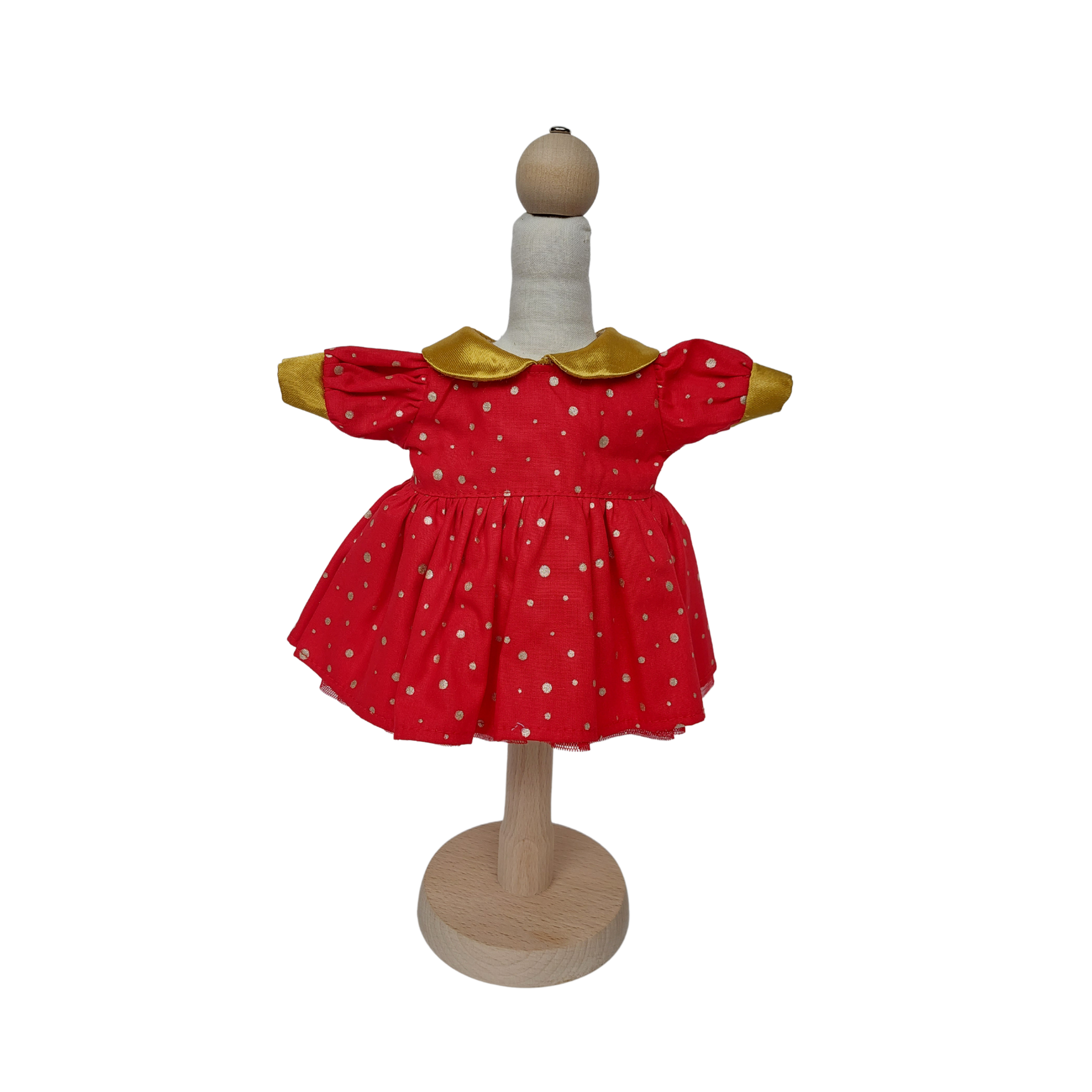 Piękna czerwona sukienka uszyta z satynowej bawełny, podszyta tiulem, ze złotym kołnierzykiem i rękawkami.