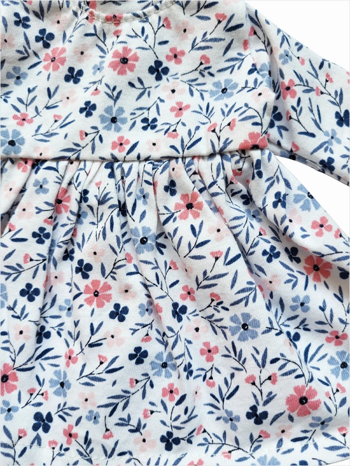Jerseyowa bawełniana, krótka sukienka z kwiatowym wzorem.