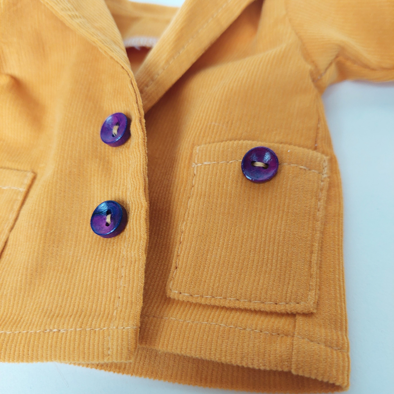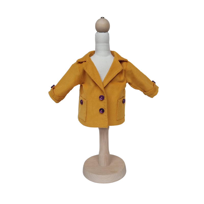 Sztruksowy płaszczyk w kolorze musztardowym, ozdobiony drewnianymi guziczkami, to doskonałe uzupełnienie garderoby lalki.